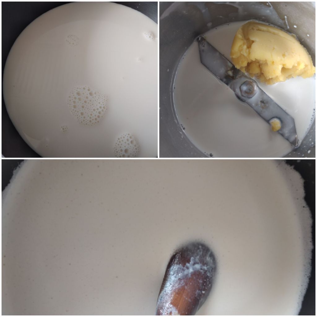 - Add sugar to according to your taste. The moong will thicken the milk and also give a beautiful light yellow colour. Cool it down before using.