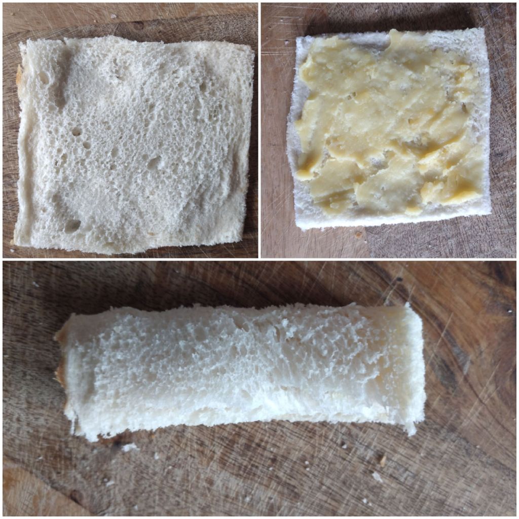 Cut the sides from the bread slices. Flatten them out with a rolling pin. The sides should be thinner than the centre. Wrap them up with a damp kitchen cloth.