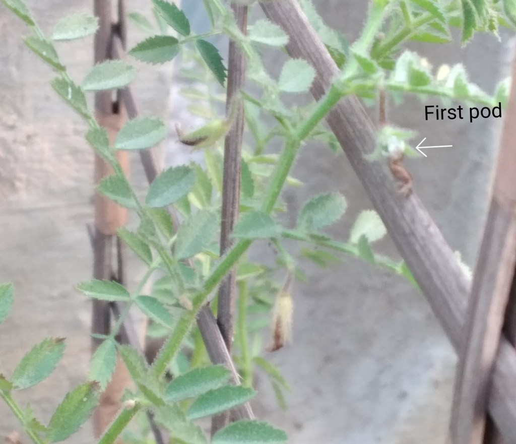 When the plant was about 55 days old, one little withered flower showed up a tiny pod at its base. That was our first pod. It is shown with an arrowhead.