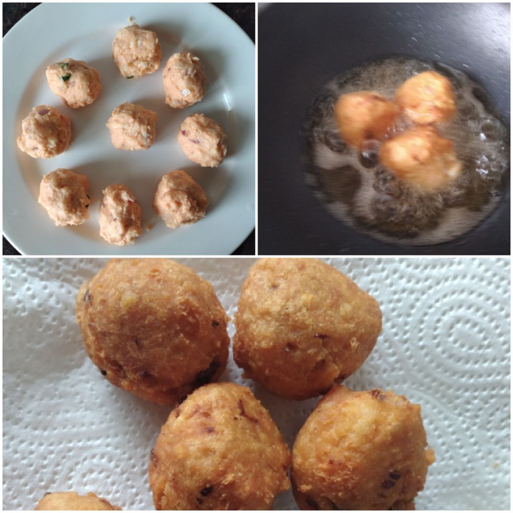 8. Deep fry them over low heat. It takes about 3 to 4 minutes for a batch of three balls.