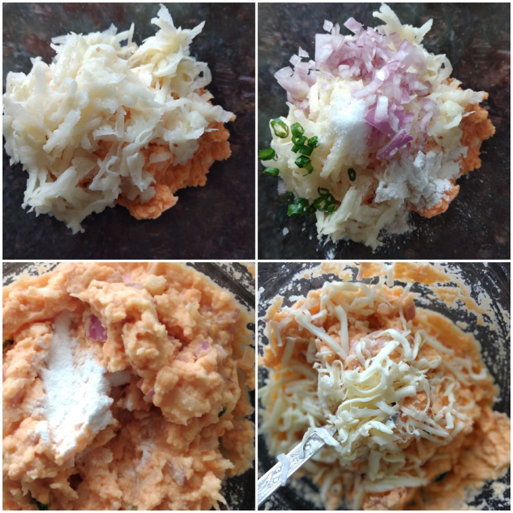 4. Add grated potato, onion, chilli, salt, corn flour and baking powder to the dal mixture.