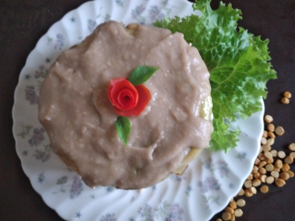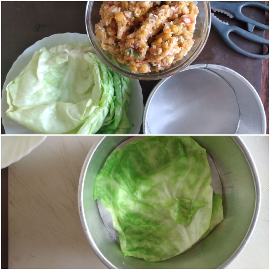 Grease a round baking pan and cover its base with a cabbage leaf as shown in the picture.