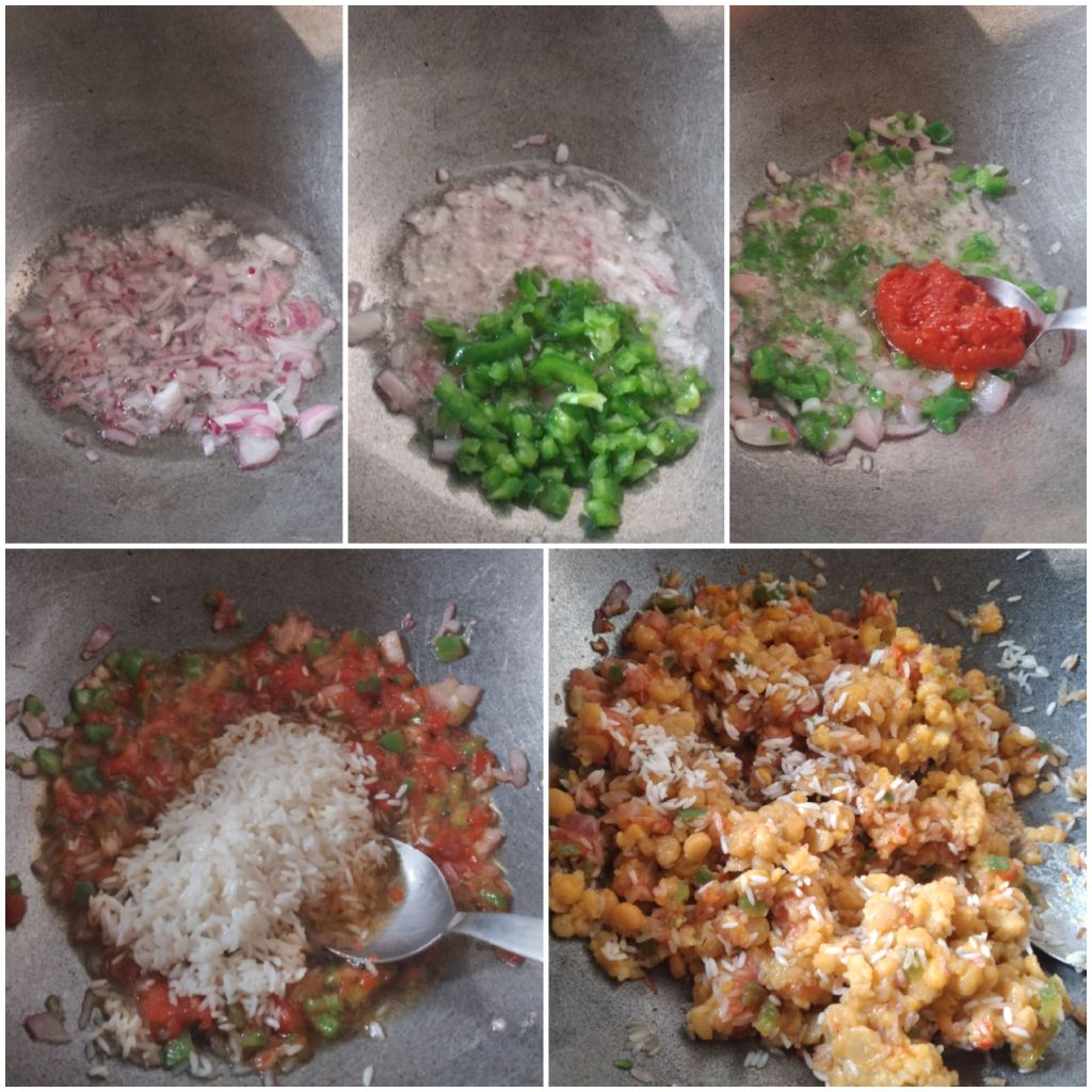 In a heave pan heat 2 Tbsp of refined oil. Add the onion and sauté it for few seconds. Add the capsicum and ¼ tsp of pepper powder and fry a little. Add the tomato puree and stir well. Add rice and mix well. Next carefully fold in the channa dal into the fried mixture. Switch off the heat.