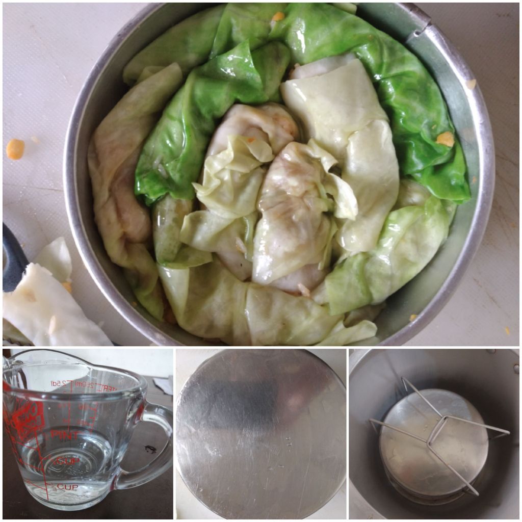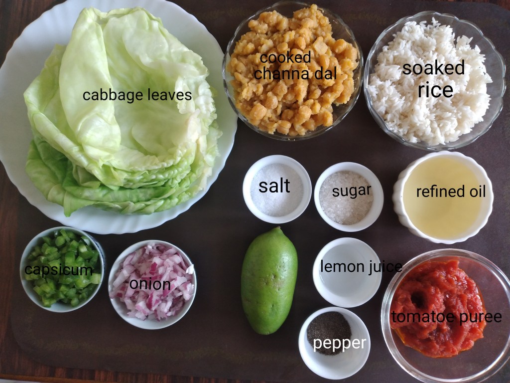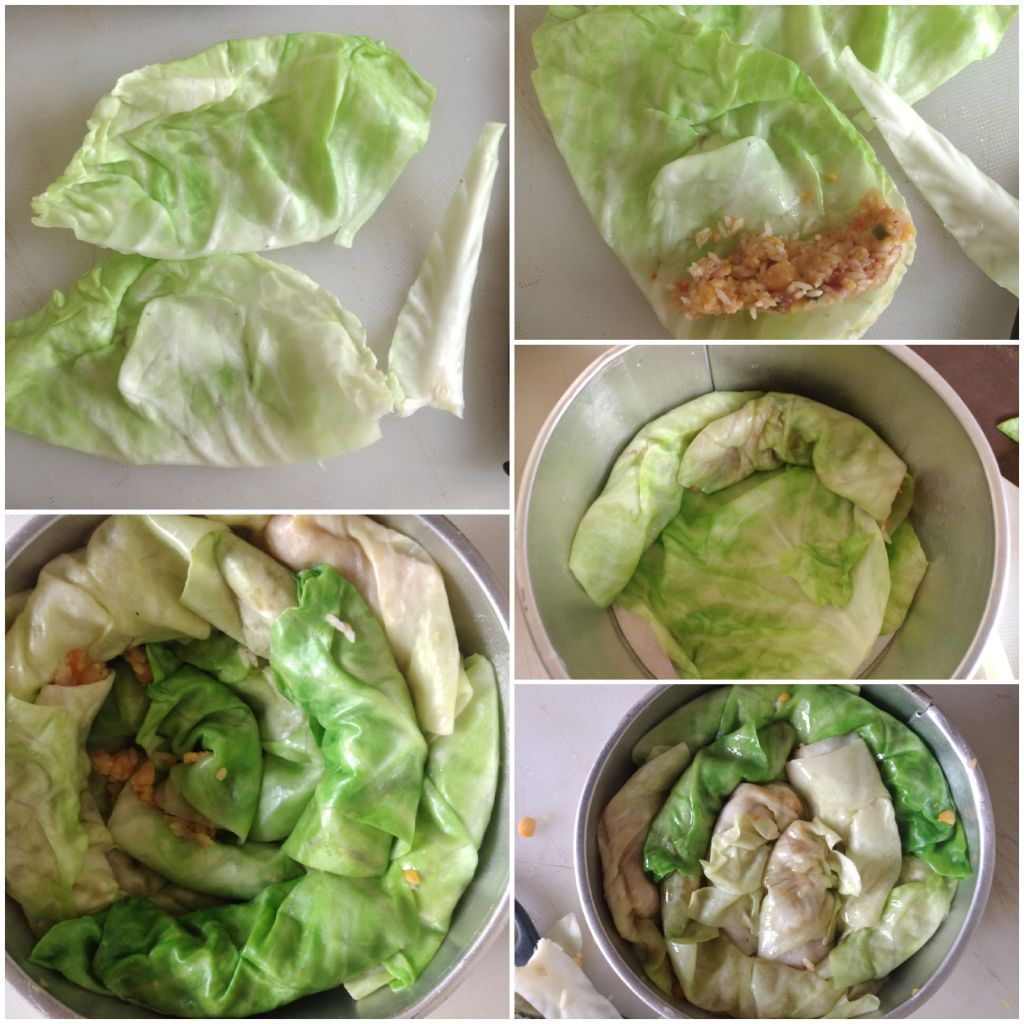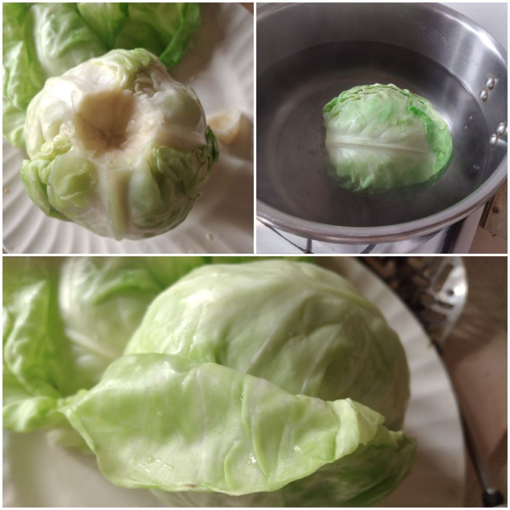 Take a medium size cabbage and cut the stem from the head of the cabbage deep enough. This will help the separation of the outer leaves from the core. Dip the cabbage in boiling water. Remove the first loosened leaf. Dip again and continue to remove the leaves one by one.