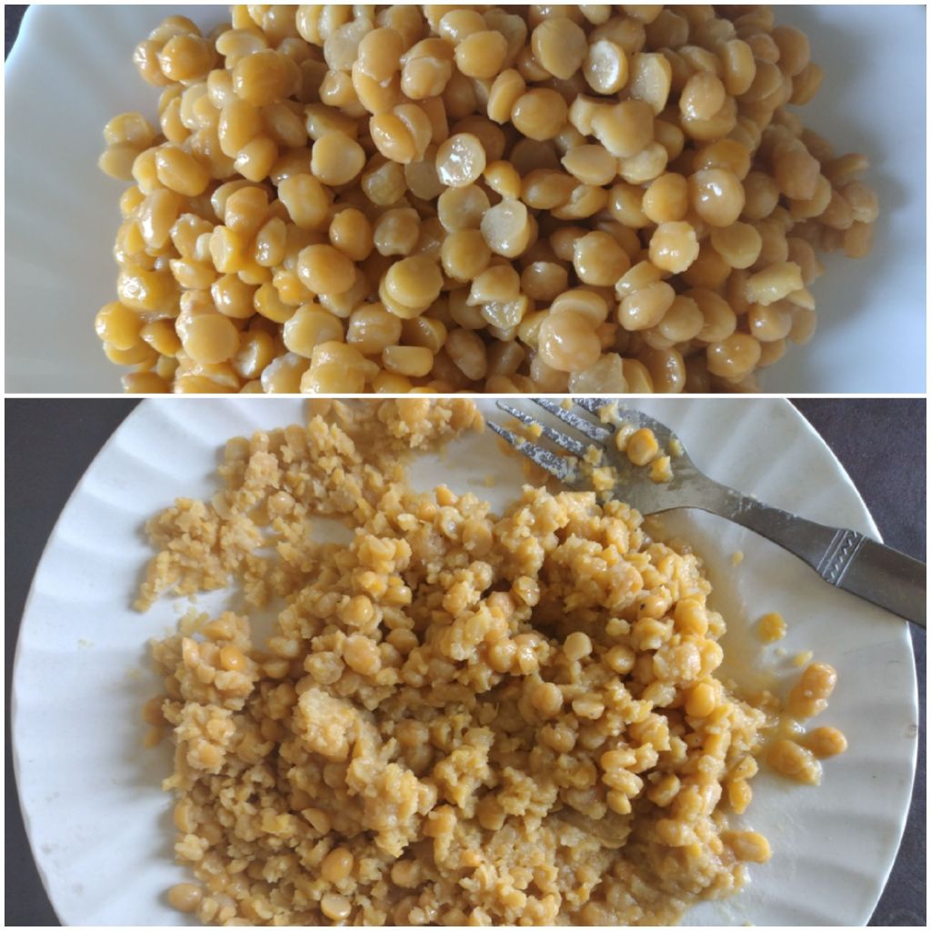 Wash and cook the channa dal in pressure cooker with ½ cup of water and ½ tsp of salt. After the lst whistle, reduce the heat and cook for 3 minutes. Take the dal on a plate and crush ¾ of the dal with a fork.