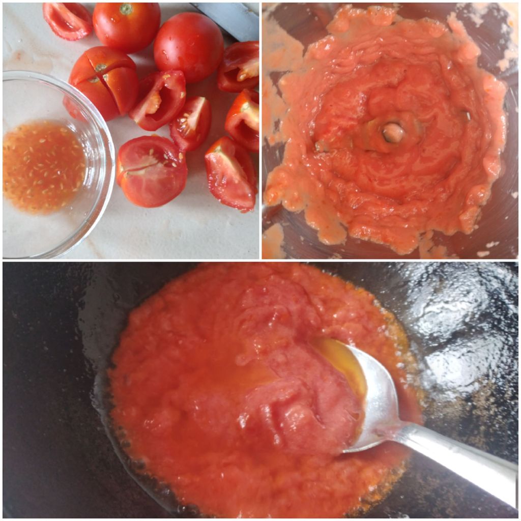 Wash and cut 2 or 3 tomatoes, remove seeds if any and grind finely. Heat a heavy pan with 1 tsp refined oil and cook the pulp with ½ tsp of salt until it become little thick.