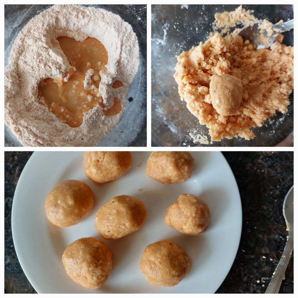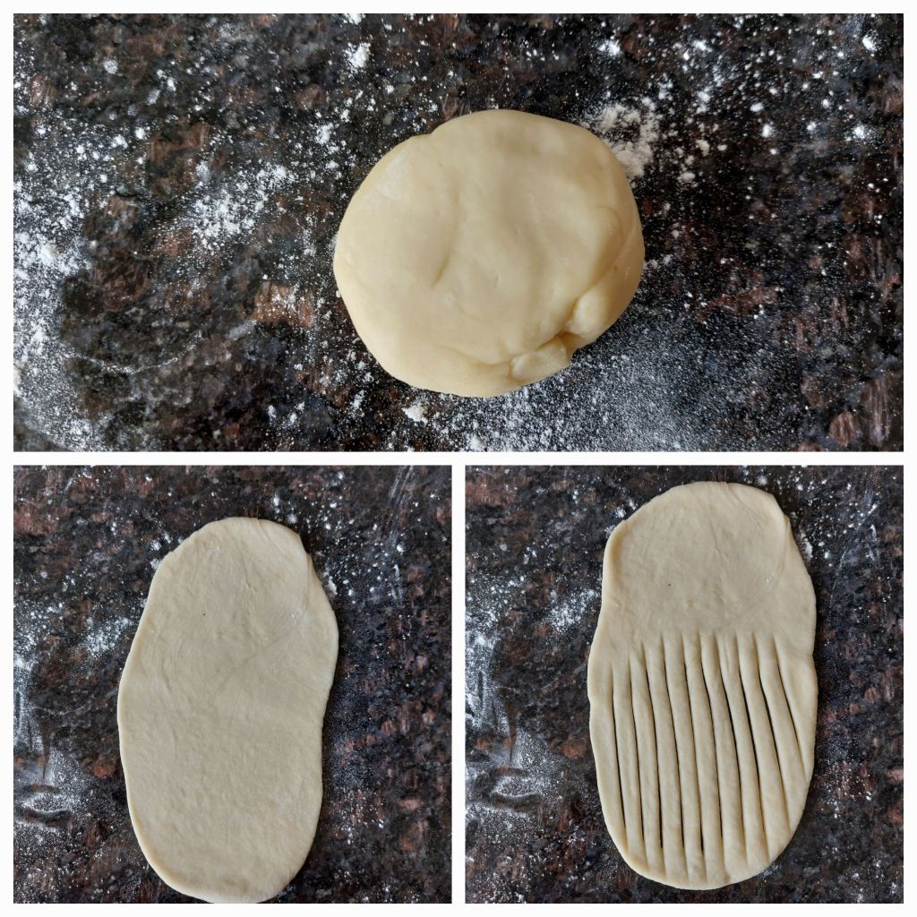 6. Form dough with the mixture and roll it out to about ½ cm thickness.