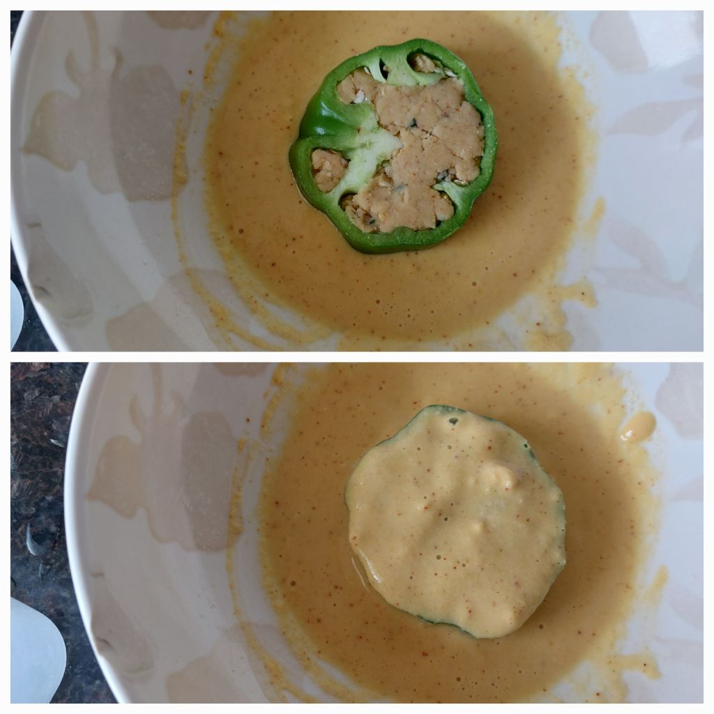 13. Dip both the sides of the capsicum slice as shown in the picture.