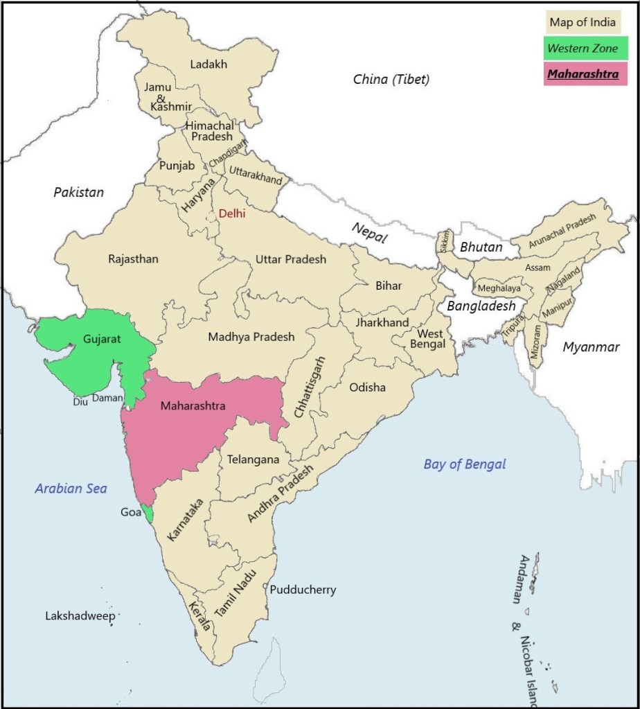 Maharashtra is located in the western and central part of India.It is bordered by the Arabian Sea to the west. The Indian states Karnataka and Goa are to the south, Telangana to the southeast and Chhattisgarh to the east, while Gujarat and Madhya Pradesh are to the north. Nagar Haveli Union territory lies in the north-west.