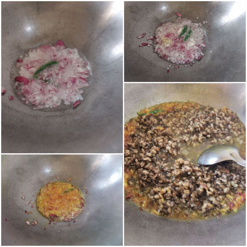 5. In a heavy pan heat the oil, add onion and the chillies and sauté for a while.