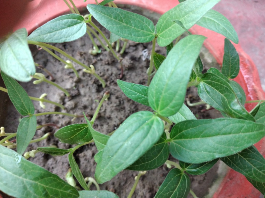 One of the fully matured plant in the pot shows the plants had 4 compound leaves. The ‘true leaves’ were still there. The height of the plant was about 44-45 cm. The leaves are marked as 1,2,3 and 4. The flowers come out from the base of the last leafstalks.