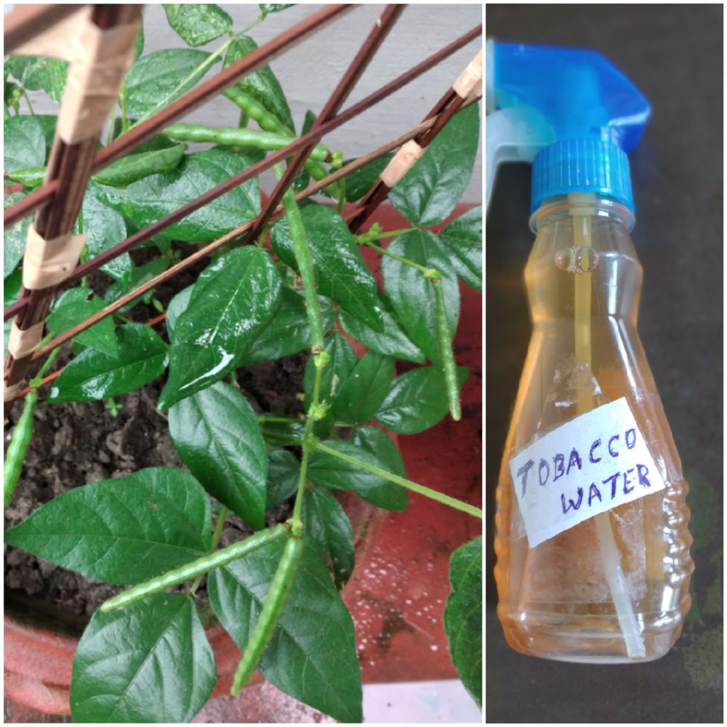 (Few pieces of tobacco leaves soaked in water overnight. Next morning the gardener filtered the liquid. That was his remedy.)
