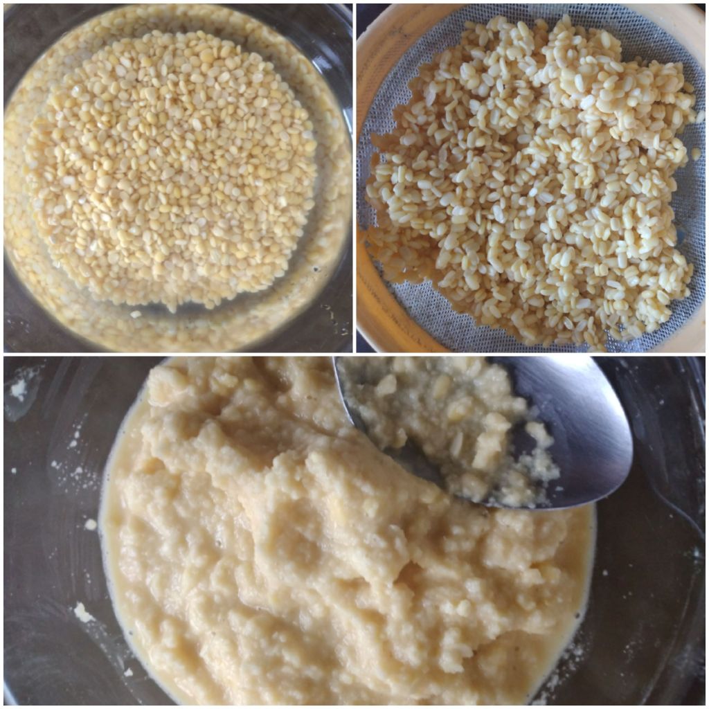- Wash and soak dal for about 4 hours. Drain it well and grind it coarsely with as minimum water as possible.