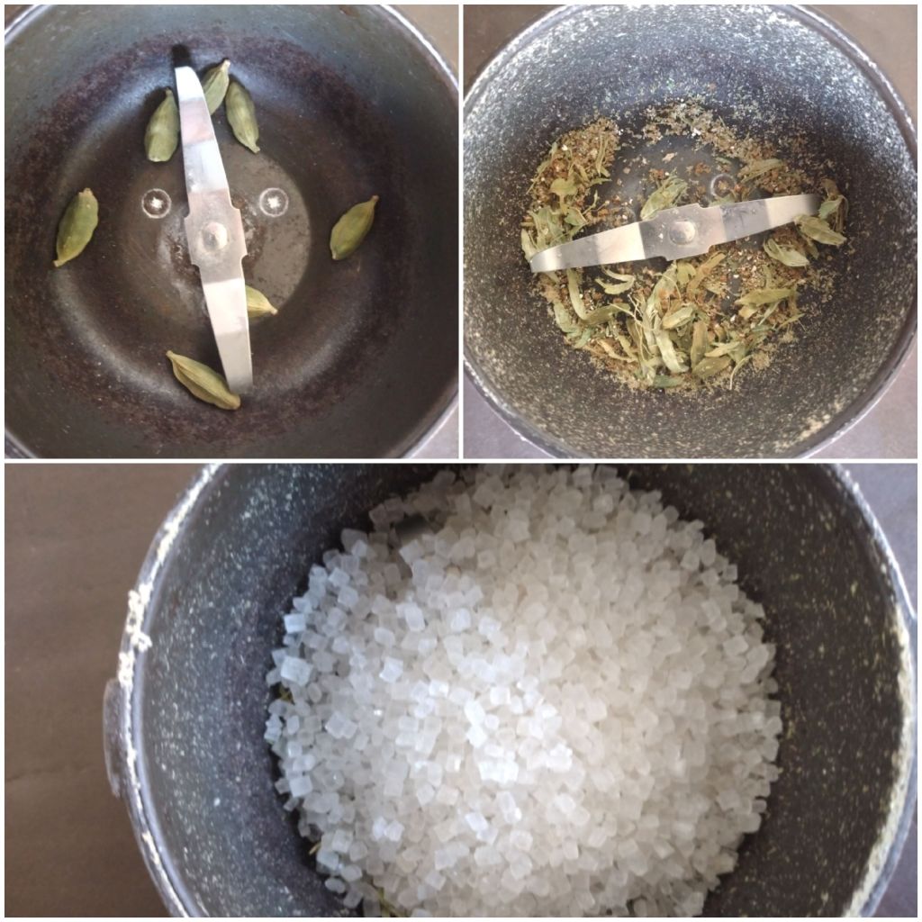 4. Grind sugar and the cardamom powder together and sieve the mixture through a fine sieve and keep it aside.