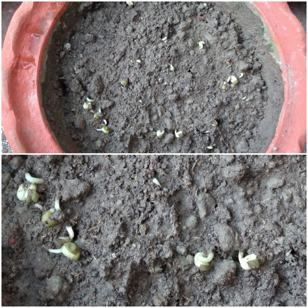 On the 4th day, both in the glass as well as in the pot the shoots emerged to the top of the soil with their cotyledons.