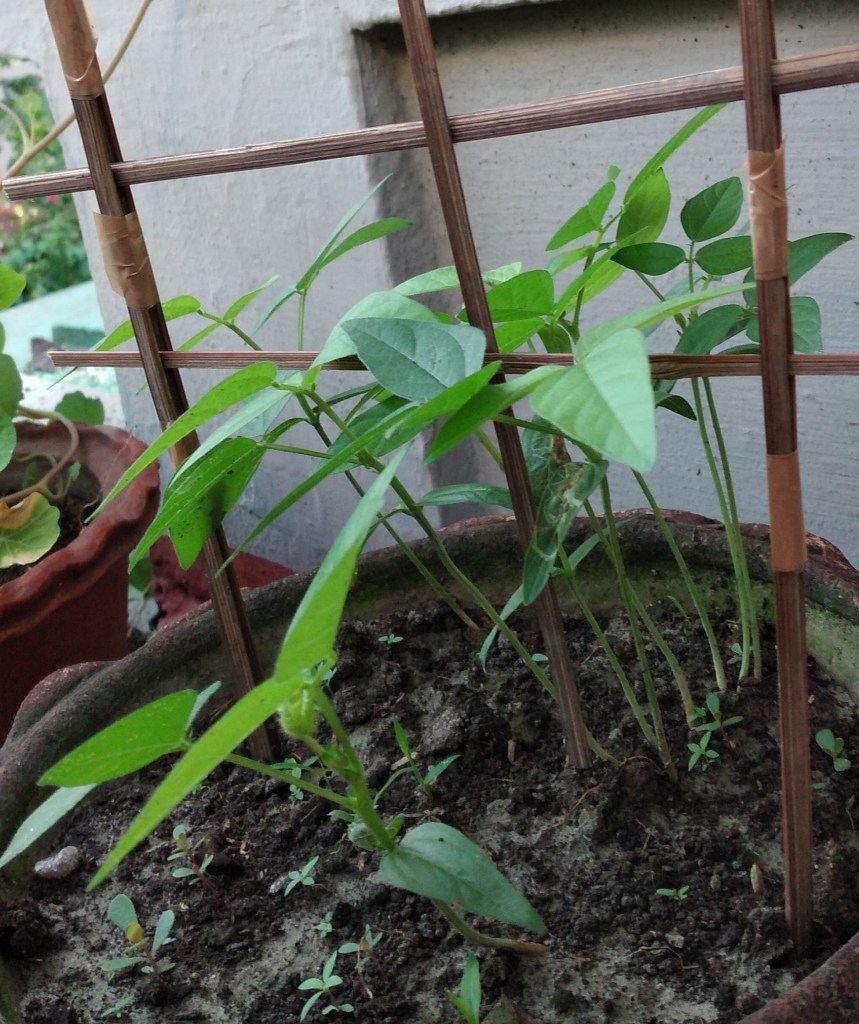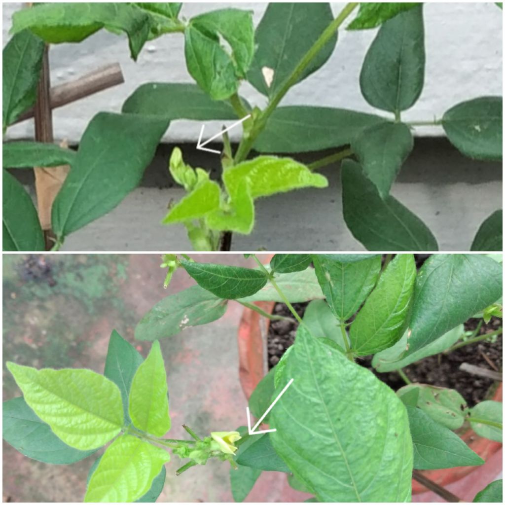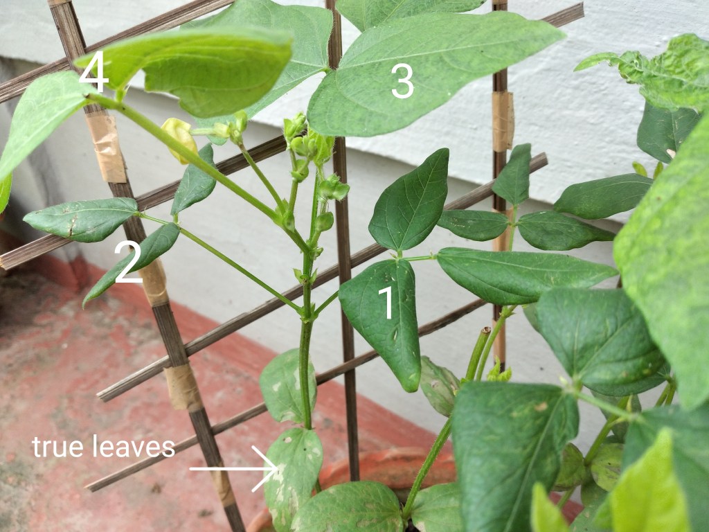 One of the fully matured plant in the pot showed the plants had 4 compound leaves, the ‘true leaves’ were still there and its height was about 44-45 cm tall. The leaves are marked as 1,2,3 and 4. The flowers come out from the base of the last leafstalks.