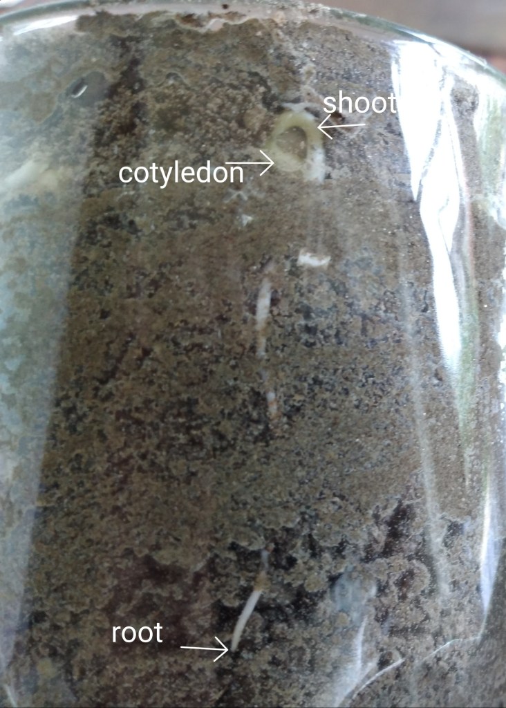 On the 2nd day seed coat burst. Since the picture was taken through glass it was not very clear. The seed is marked with an arrow head.