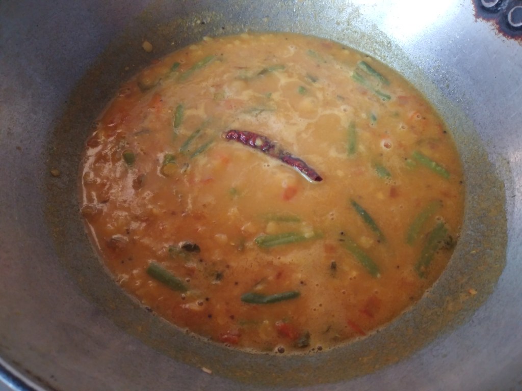 Fry all the spices until the aroma of the sambar powder is released. Pour the cooked dal over the fried spices. Add warm water to adjust the consistency of the dal. As dal begins to boil add the cooked vegetable. Add 1 Tbsp of the tamarind puree. Adjust the salt.