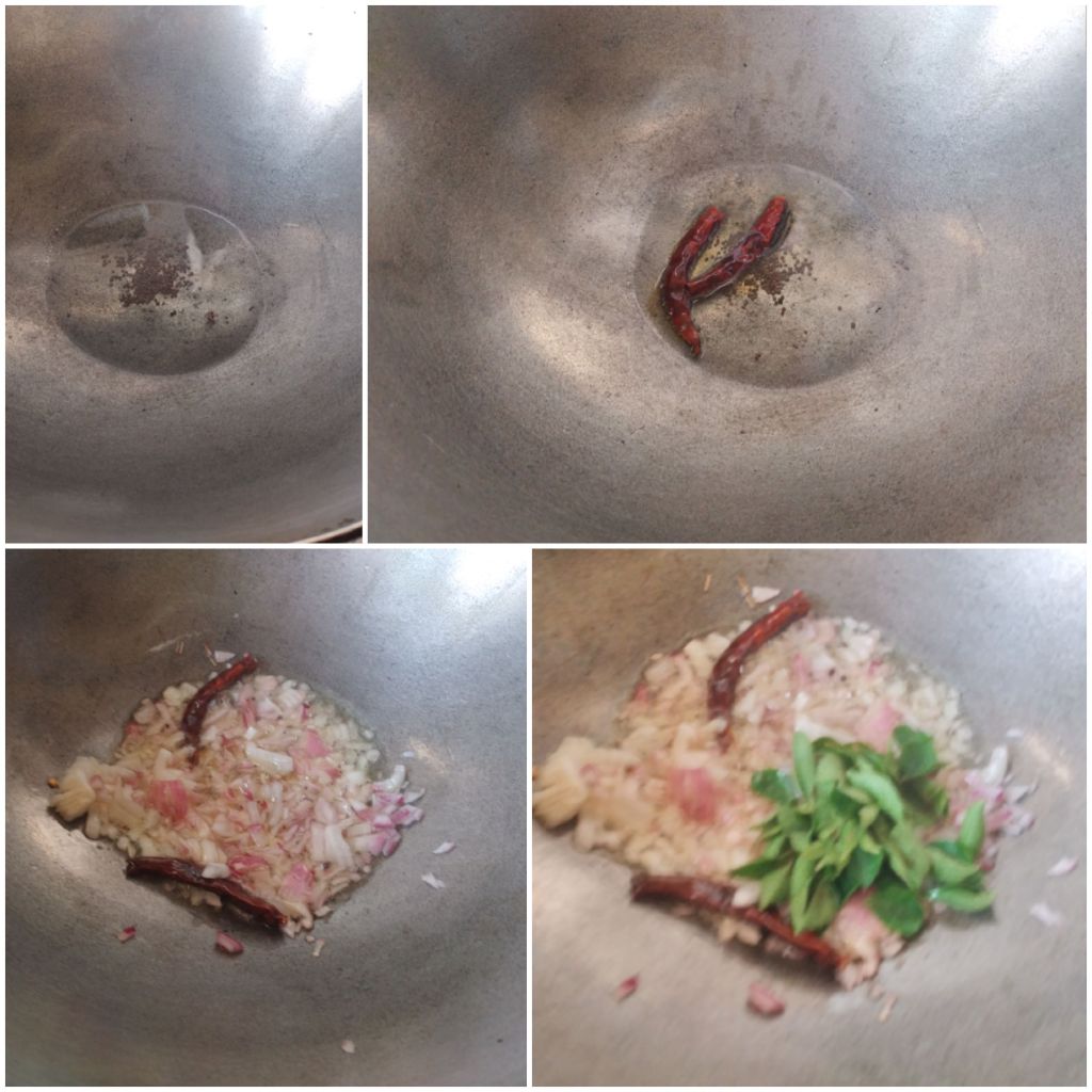 Heat the oil in a big pan. Reduce the heat and add mustard seeds and allow it to crackle. Add the dry red chillies and fry a little. Add onion and sauté till transparent, add curry leaves and fry for few more seconds.