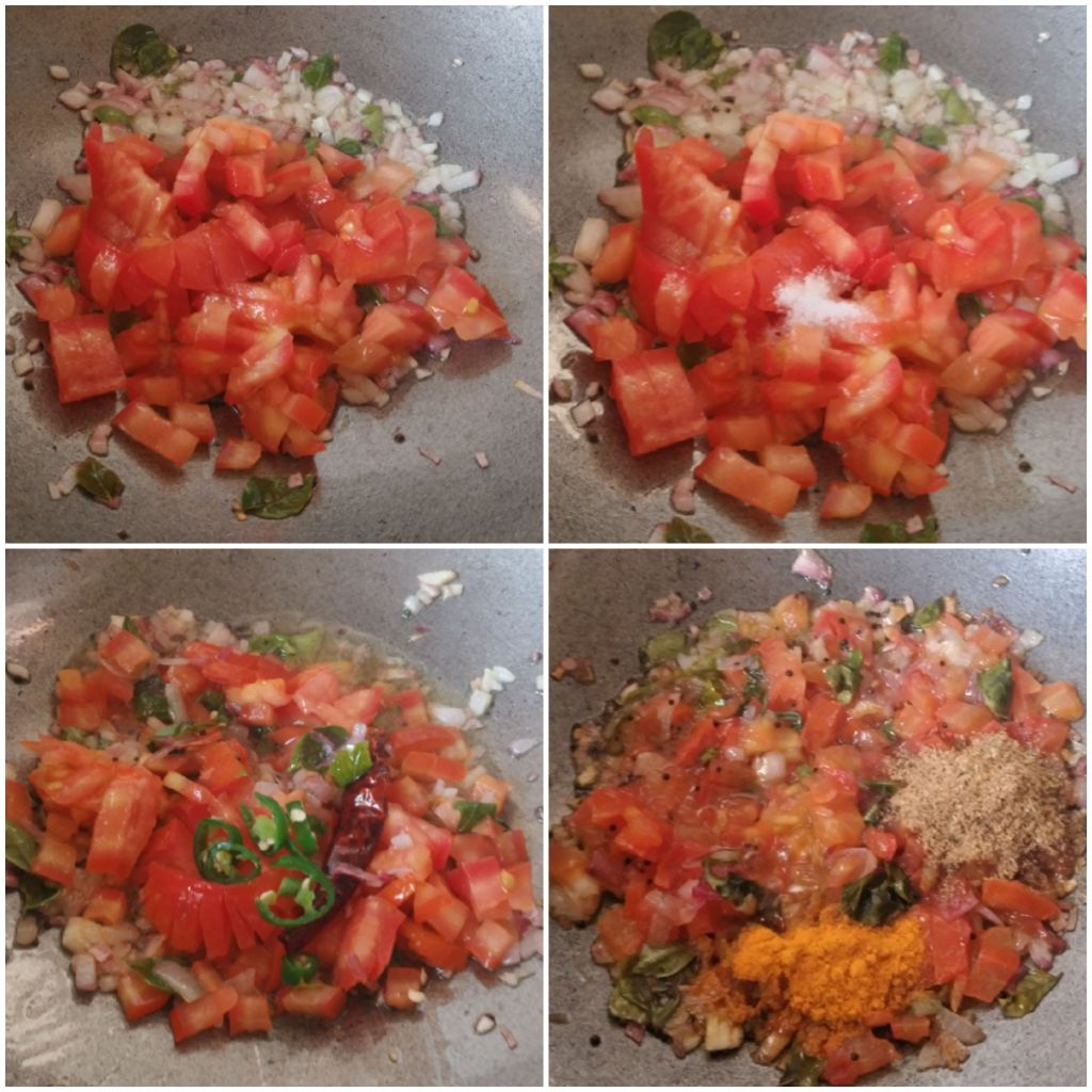 Add the chopped tomatoes and ½ tsp of salt and fry for about 30 seconds. The salt will help the tomato to get soft quickly. Add the chopped green chilli if you like hot sambar.